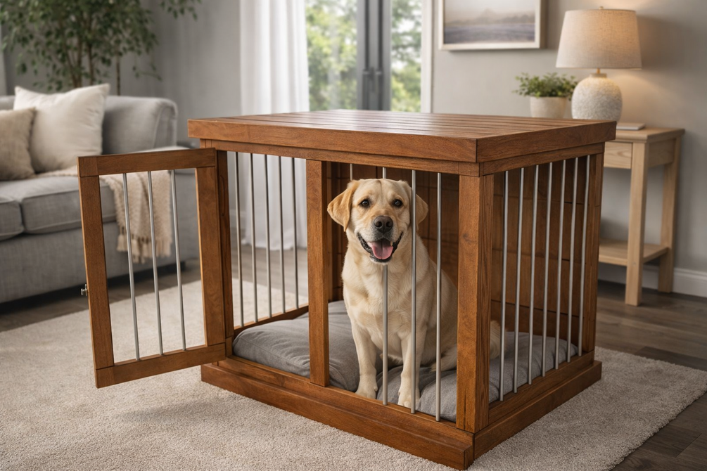 This makes for a great piece for your living room, as it has both a beautiful look and a functional role. This kennel is designed for a large dog, as it has the following interior dimensions: 26"x40 1/2"x29" (lxLxh).