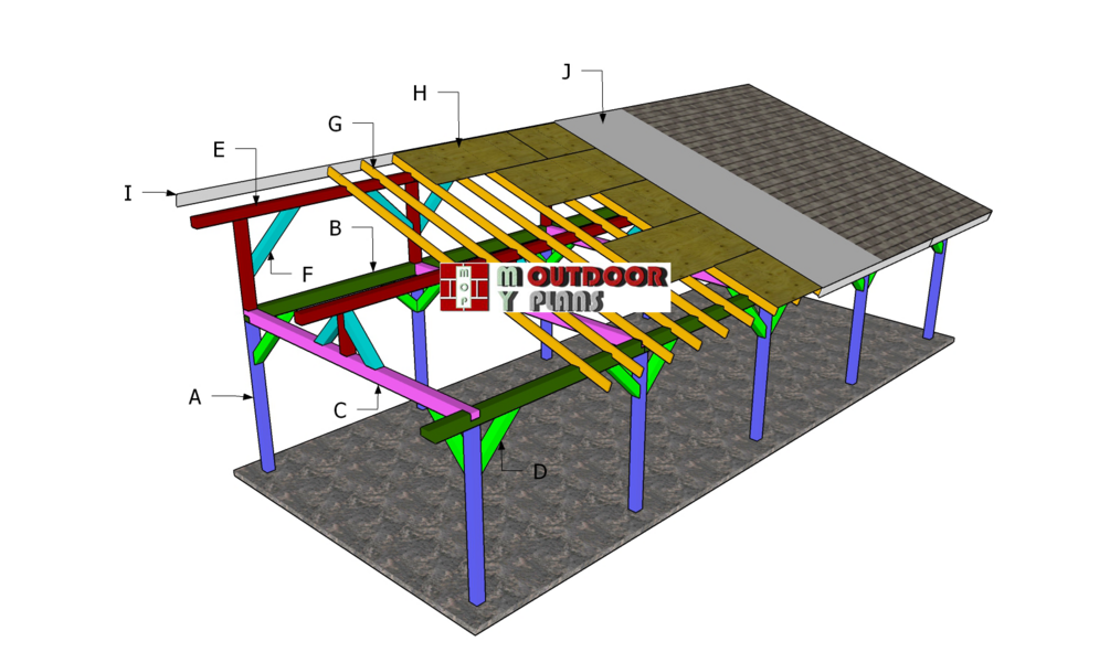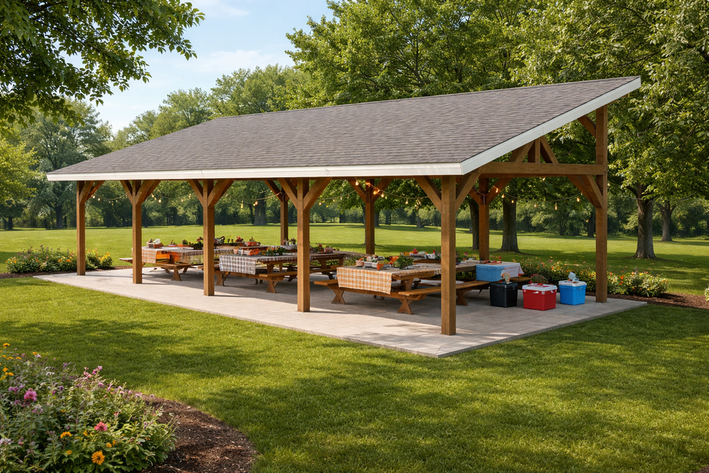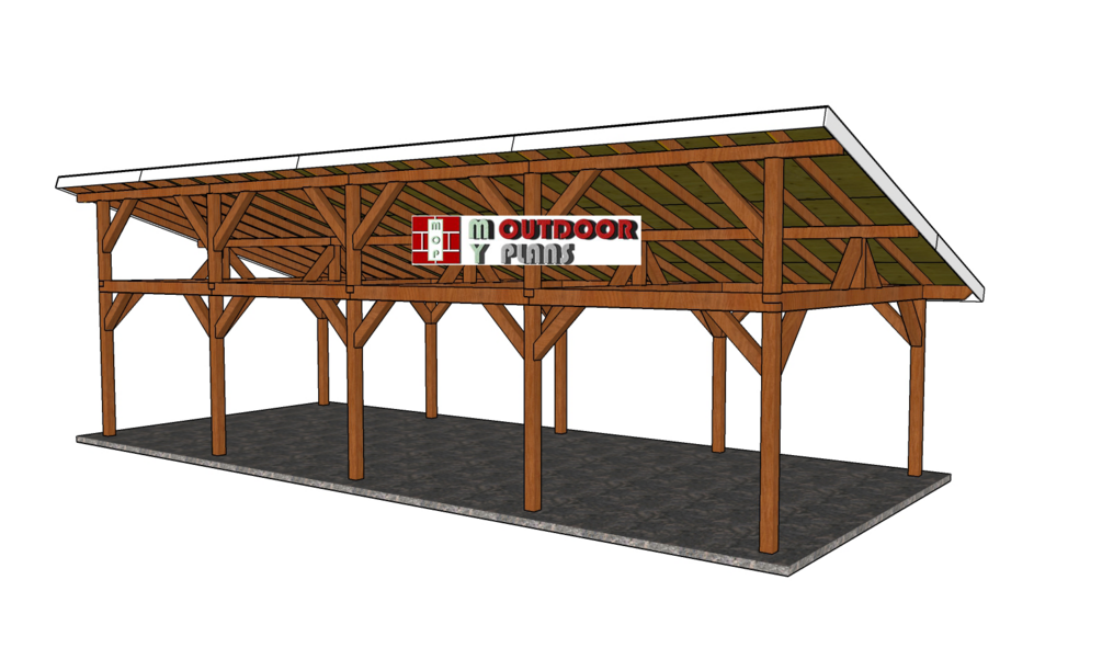 The pavilion features a lean to roof with generous overhangs on all sides. The base of the pavilion is 16'x40'. Total height of the pavilion is 14' 4". You can use pressure treated lumber for the pavilion, or invest in something weather resistant like cedar or redwood.