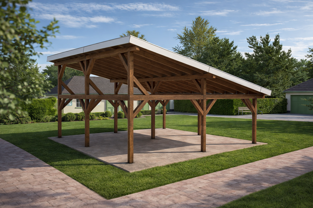 The pavilion features a lean to roof with generous overhangs on all sides. The base of the pavilion is 24'x24'. Total height of the pavilion is 15' 4". You can use pressure treated lumber for the pavilion, or invest in something weather resistant like cedar or redwood.