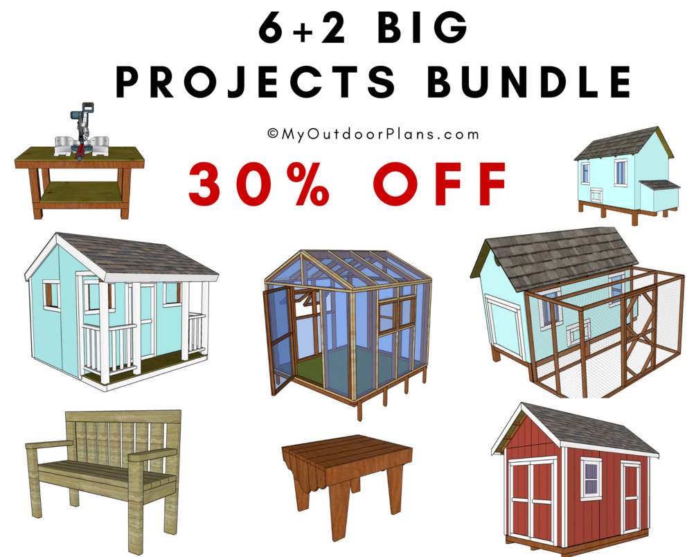 Starting building projects for your backyard with this collection of 6+2 woodworking plans Get 6 plans to build a shed, a greenhouse, a chicken coop with run and a workbench. You'll save 30% off the normal price ($40.99 if you get the plans separately) by buying this bundle! These plans will basically help you overhaul your backyard and create an area for storage, an area for growing vegetables an area for growing chickens.