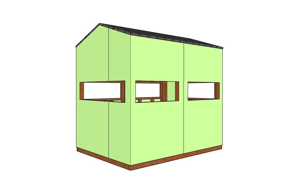 This deer blind features a gable roof and window openings on all sides. A door for easy access is also present. This has a sturdy structure made from 2x4s.