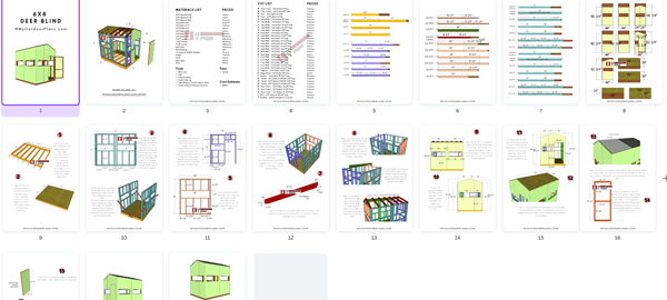 You'll get a PDF with step by step diagrams, instructions and a Full Cut and Shopping lists, to build a 6x8 deer blind. Measurements are in imperial, not metric.