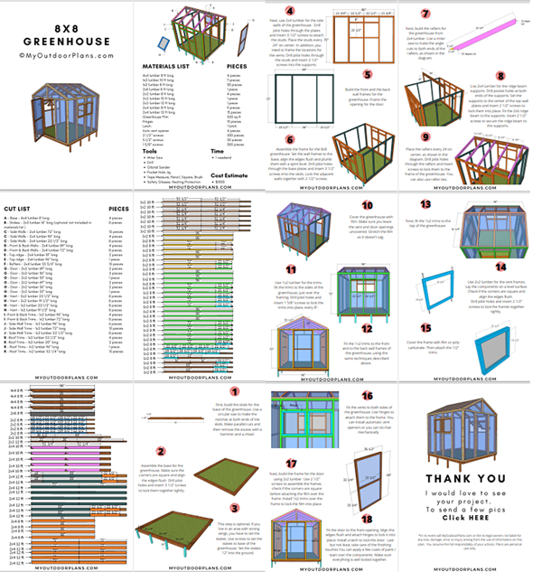 You'll get a PDF with step by step diagrams, instructions and a Full Cut and Shopping lists, to build a small greenhouse. Measurements are in imperial, not metric.