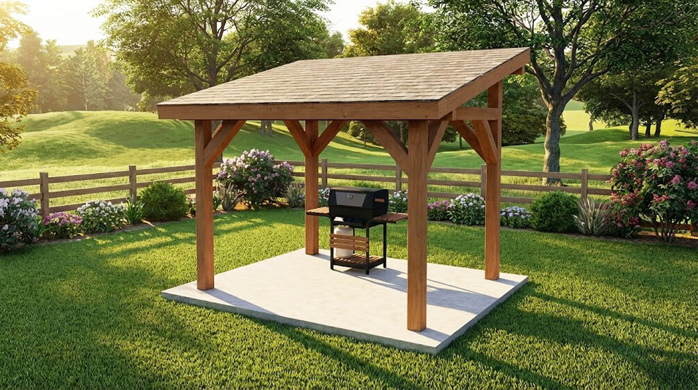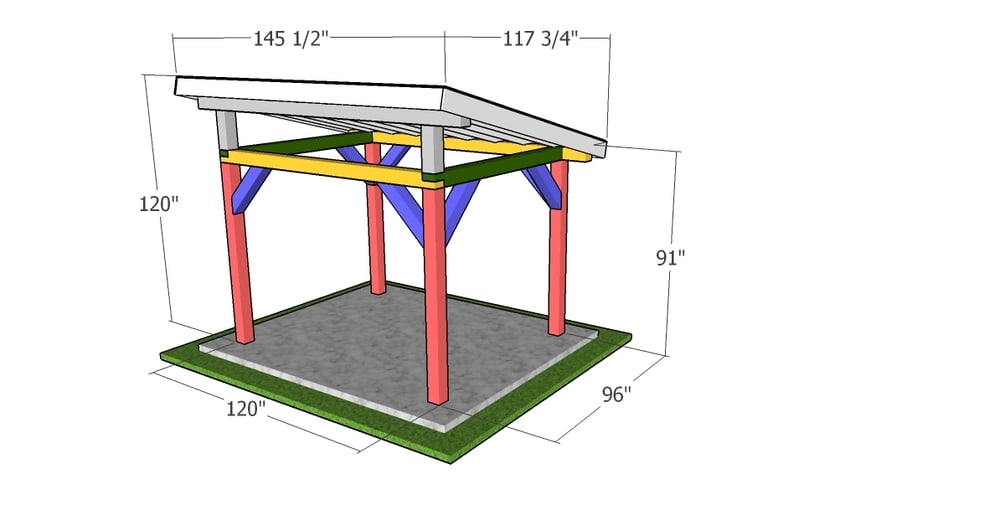 This step by step diy woodworking project is about a 8x10 wooden pavilion with lean to roof plans. I designed this small slanted pavilion with a 8x10 base, so you can cover your grill / bbq / pizza oven. This pavilion has a 6x6 structure and a lean to roof with a 3:12 pitch. This pavilion makes for a perfect bbq cover or a small area for taking dinner.