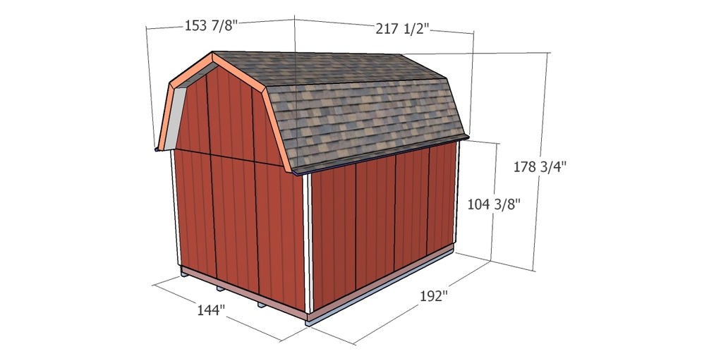You'll get a PDF with step by step diagrams, instructions and a Full Cut and Shopping lists, to build a 12x16 shed with a gambrel roof. Measurements are in imperial, not metric.