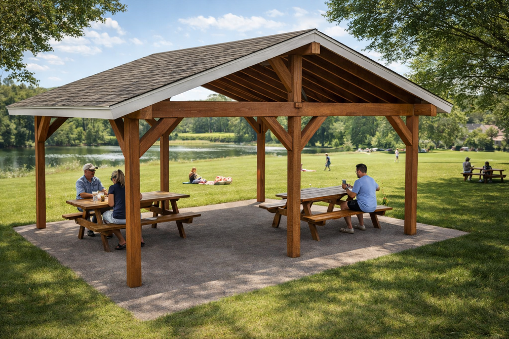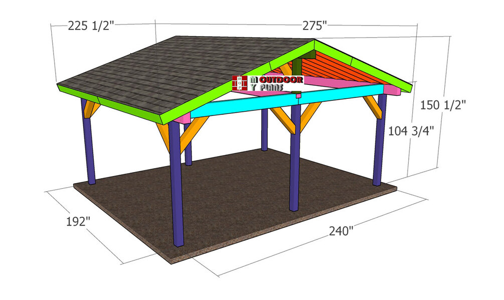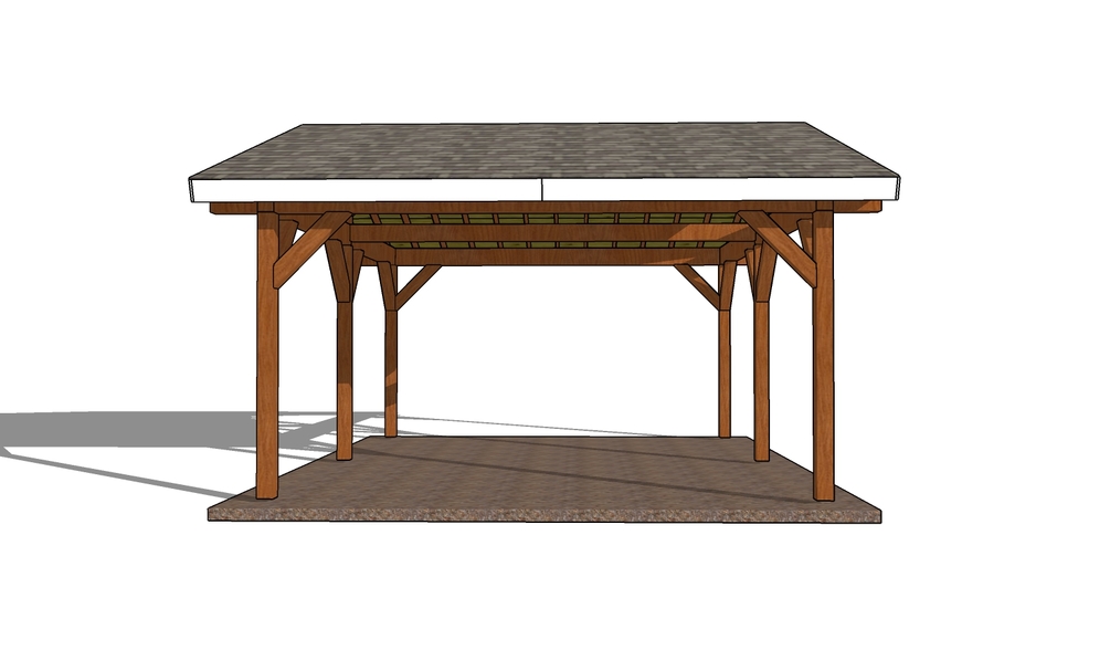 The pavilion features a gable roof with a 4:12 pitch with generous overhangs on all sides. The base of the pavilion is 20'x16'. You can use pressure treated lumber for the pavilion, or invest in something weather resistant like cedar or redwood.