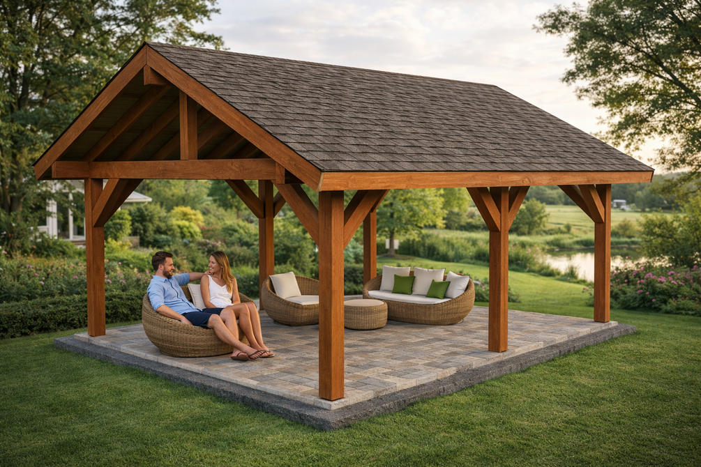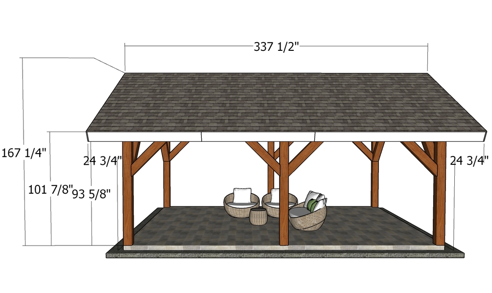 The pavilion features a gable roof with a 6:12 pitch with generous overhangs on all sides. The base of the pavilion is 18'x24'. You can use pressure treated lumber for the pavilion, or invest in something weather resistant like cedar or redwood.