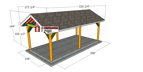 The roof for this pavilion has a pitch of 6:12 and features openings on all sides. Make sure you take a look over the local building codes, so you comply with the regulations.