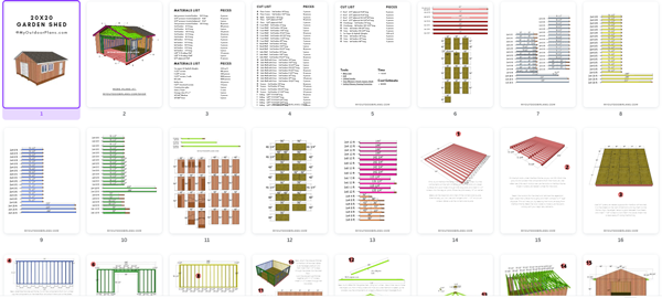 You'll get a PDF with step by step diagrams, instructions and a Full Cut and Shopping lists, to build a 20x20 shed with a gable roof. Measurements are in imperial, not metric.