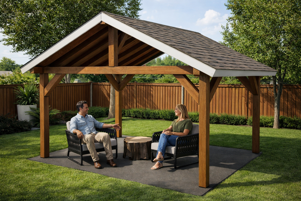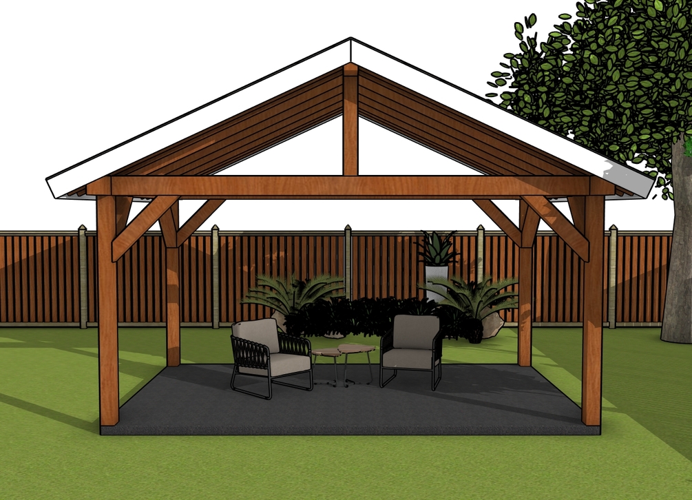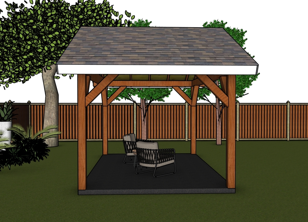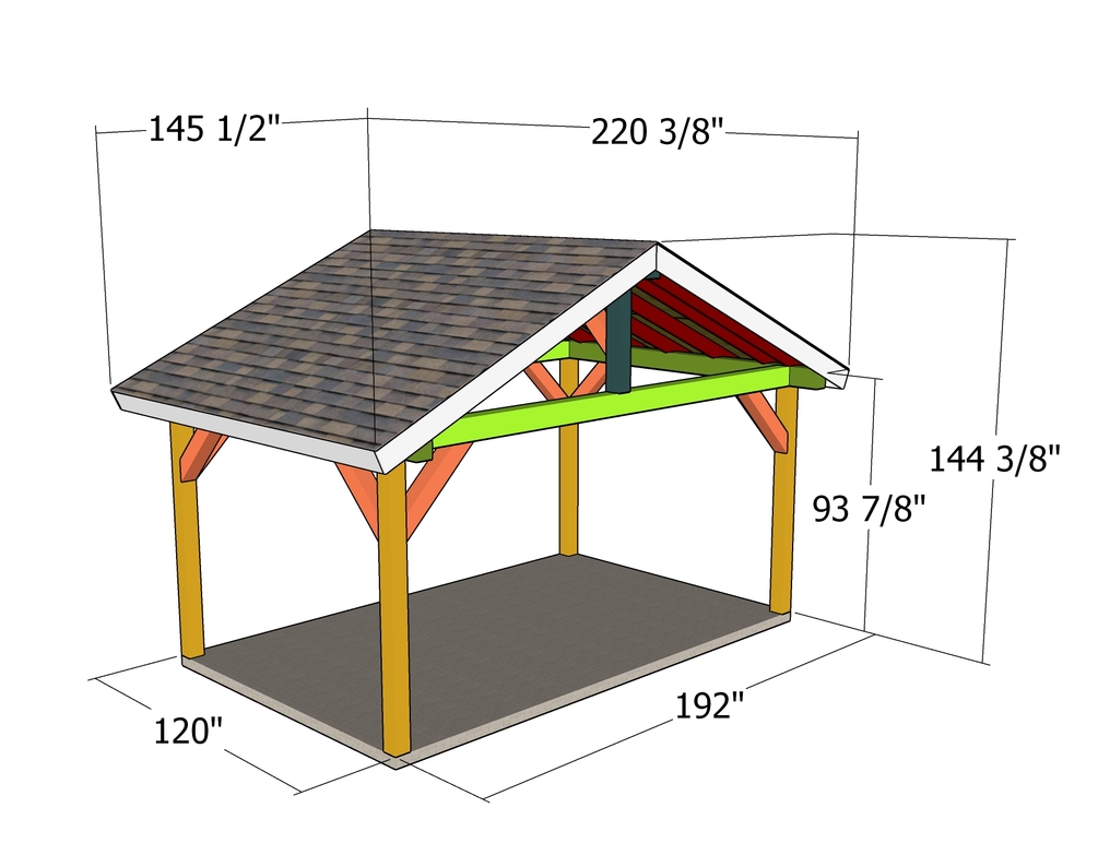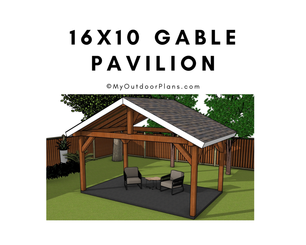 The pavilion features a gable roof with a 6:12 pitch with generous overhangs on all sides. The base of the pavilion is 16'x10'. You can use pressure treated lumber for the pavilion, or invest in something weather resistant like cedar or redwood.