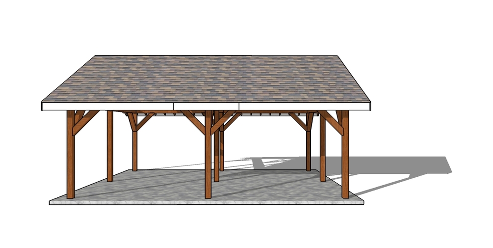 The pavilion features a gable roof with a 6:12 pitch and 1 ft overhangs on the sides and 16" on the front and back. The base of the pavilion is 20'x24' outside post to outside post. You can use pressure treated lumber for the pavilion, or invest in something weather resistant like cedar or redwood.