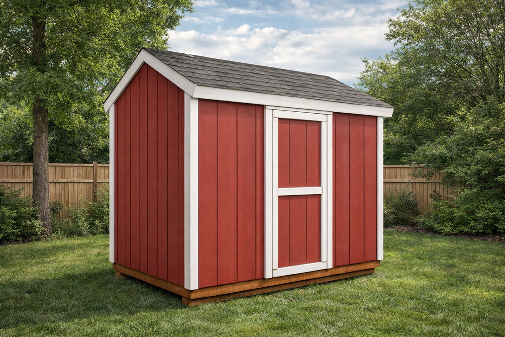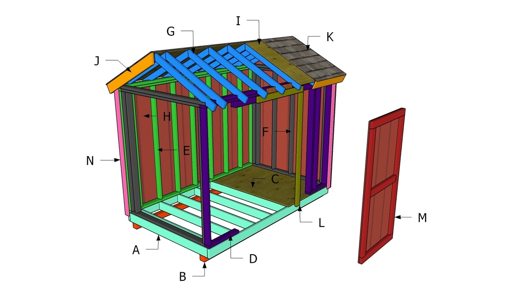 The shed features a 3 ft door to the front. The plans are designed with efficiency in mind, so you won't waste materials. The overall height of the shed is 9'. The roof has a 6:12 pitch. You can easily modify the plans to suit your needs. This shed is ideal for the garden tools or to shelter something like a pump or outdoor furniture.