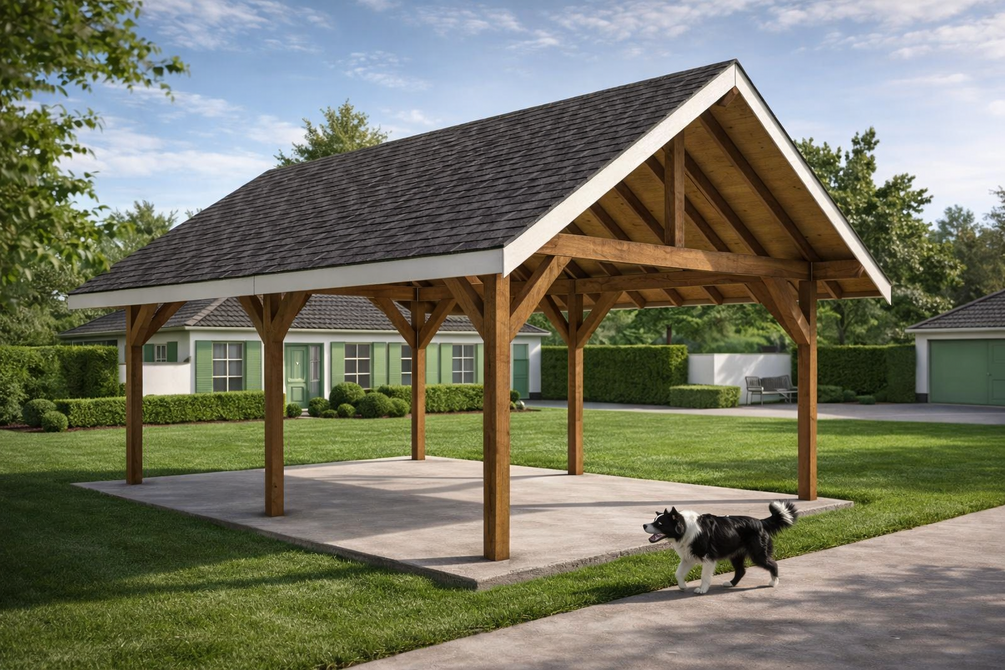 The pavilion features a lean to roof with 24" overhangs on all sides. The base of the pavilion is 16'x24'. You can use pressure treated lumber for the pavilion, or invest in something weather resistant like cedar or redwood. The roof has a 8:12 pitch. Maximum height 171" (see diagram for all dimensions)