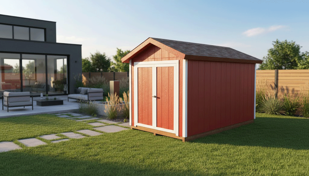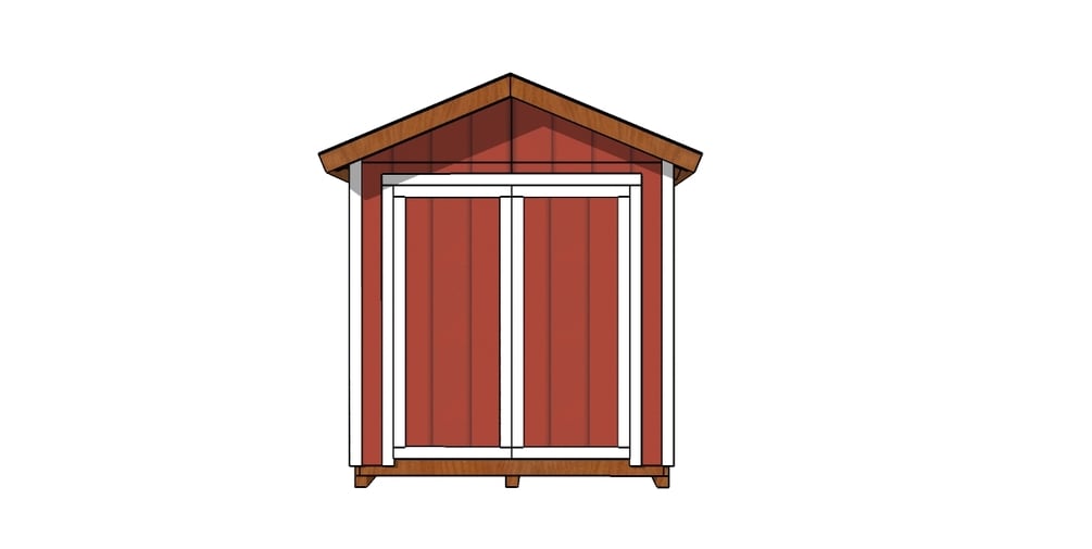 This shed features double doors on the front and a gable roof with a 5:12 pitch. The studs and trusses are placed every 24” on center. Remember that you need to select the site for the shed with attention and that you have to comply with a few legal regulations.