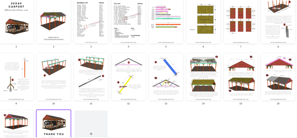You'll get a PDF with step by step diagrams, instructions and a Full Cut and Shopping lists, to build a 20x40 RV carport. Measurements are in imperial, not metric.