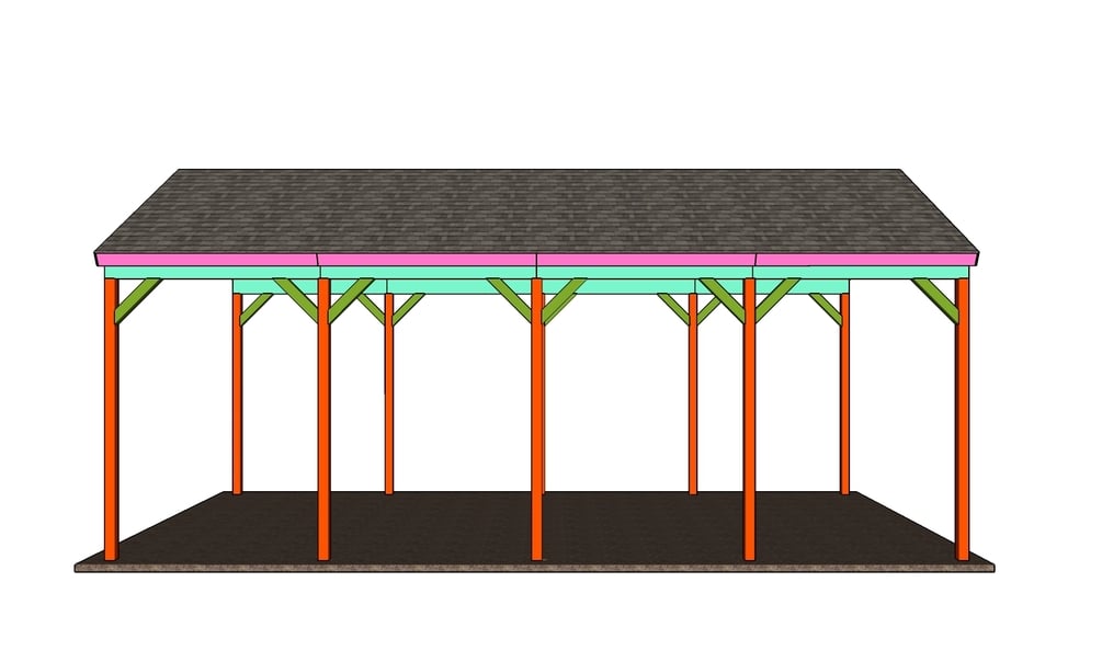 This carport is built on a 6x6 post framing and it features a roof with a 6:12 pitch. The trusses are placed every 24" on center and the sheets are made from 1/2" plywood. The carport is covered with asphalt shingles, but you can use metal sheets as well. The height of the posts is 14 ft. The footprint of the carport is 20 ft x 40 ft. The total height of the carport is 20 ft.