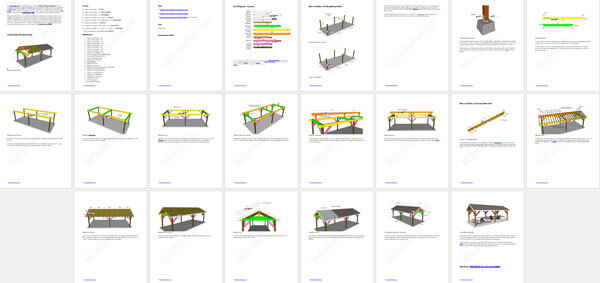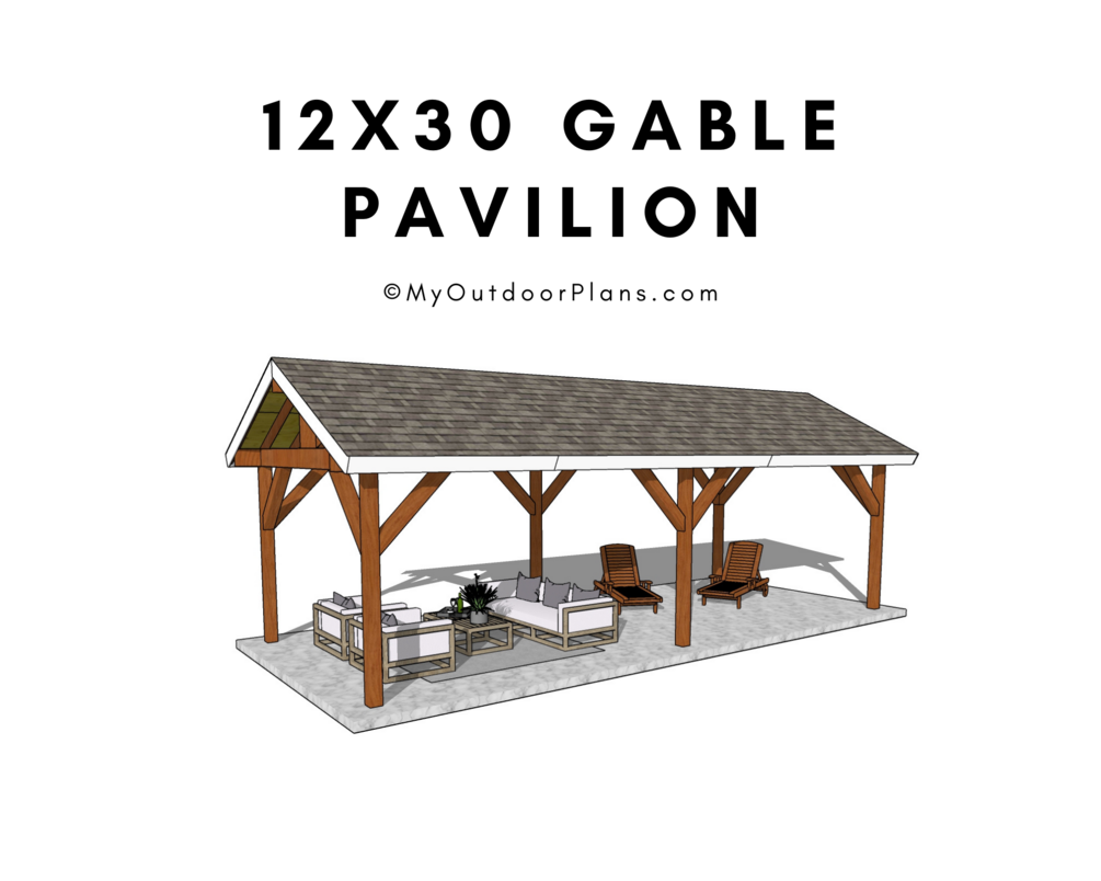 This step by step diy woodworking project is about a 12x30 gable pavilion plans. This is a large pavilion built on a sturdy 6x6 and 6x10 framing, with 6 posts and a 12 ft x 30 ft base - outside post to outside post. The roof for this pavilion has a pitch of 6:12 and features large opening on all sides.