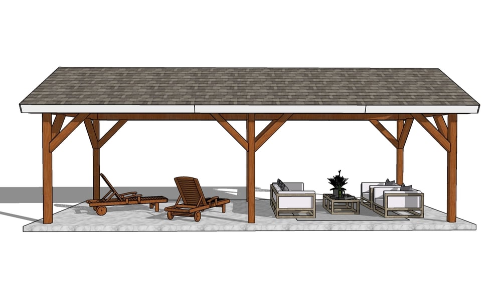 The roof for this pavilion has a pitch of 6:12 and features openings on all sides. Make sure you take a look over the local building codes, so you comply with the regulations.