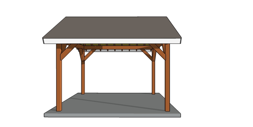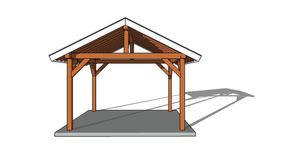 The roof for this pavilion has a pitch of 6:12 and features openings on all sides. Make sure you take a look over the local building codes, so you comply with the regulations.